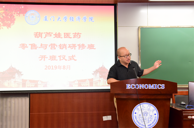 在开班仪式上,廖景峰主任首先代表厦门大学经济学院热烈欢迎pg电子医药零售与营销研修班的学员到厦大学习,并就厦门大学及经济学院的相关情况进行了介绍。他说,pg电子学员走进厦大就是厦大的校友,希望未来的日子能够关心、支持母校的发展,多提宝贵意见,同时他也祝大家在厦大学习期间学有所成、学有所获。