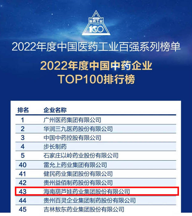 会议期间,一年一度的中国医药工业百强系列榜单隆重揭晓,pg电子药业集团凭借领先的研发优势和扎实的生产实力以及稳健的市场推广能力,连续第四年成功入选“2022年度中国中药企业TOP100排行榜” ,排名稳步上升至第43位。